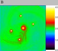 300*256*128 nodes. The resulting distributions of particle density are